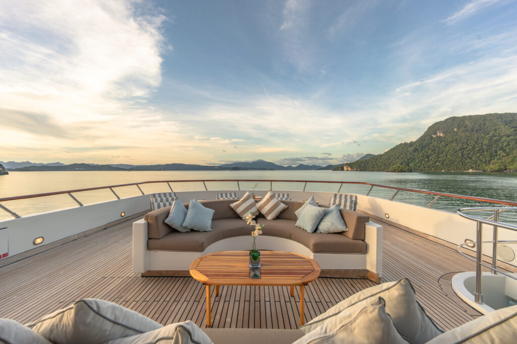Her expansive outdoor spaces offer the perfect blend of sun and shade, inviting guests to relax in style. The sundeck features a Jacuzzi, sun pads, lounge seating, and a bar, creating an ideal setting to enjoy breathtaking views and unwind. The main deck aft presents a charming alfresco dining area, perfect for savoring meals in the open air.