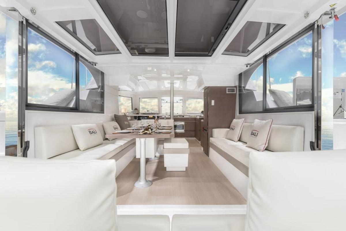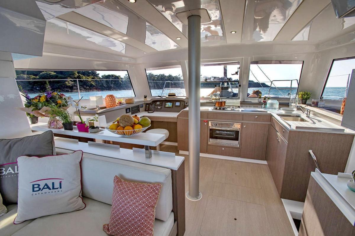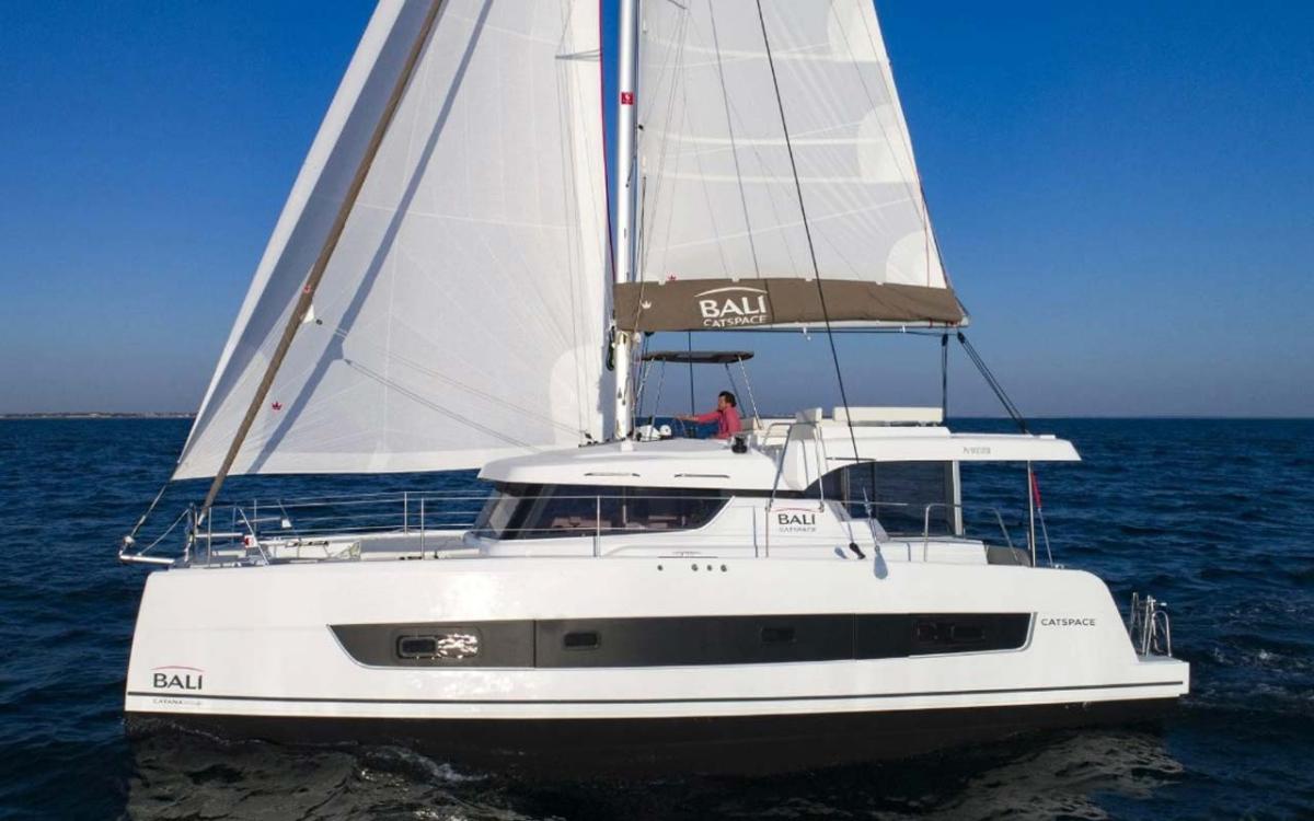 The Open Space revolution continues with the latest model in the Bali Catamarans range, the Bali CATSMART. Measuring 11.79 meters in length and 6.46 meters in width, it retains the distinctive Bali DNA, including features like a solid forward cockpit, a spacious saloon seamlessly merging with the aft cockpit, and the unique Bali tilting door. Steering is now easier than ever, thanks to two ergonomically designed helm positions on either side. The layout offers multiple configurations, from an owner version with two cabins and luxurious bathrooms to a charter version with four guest cabins and two additional bow cabins for skippers or extra guests.
