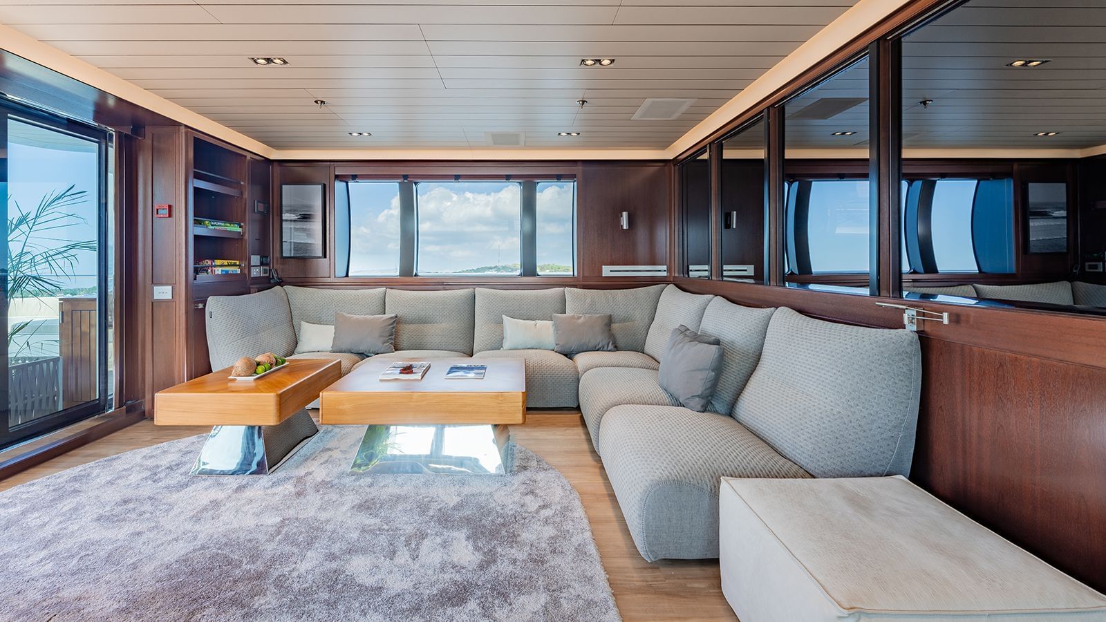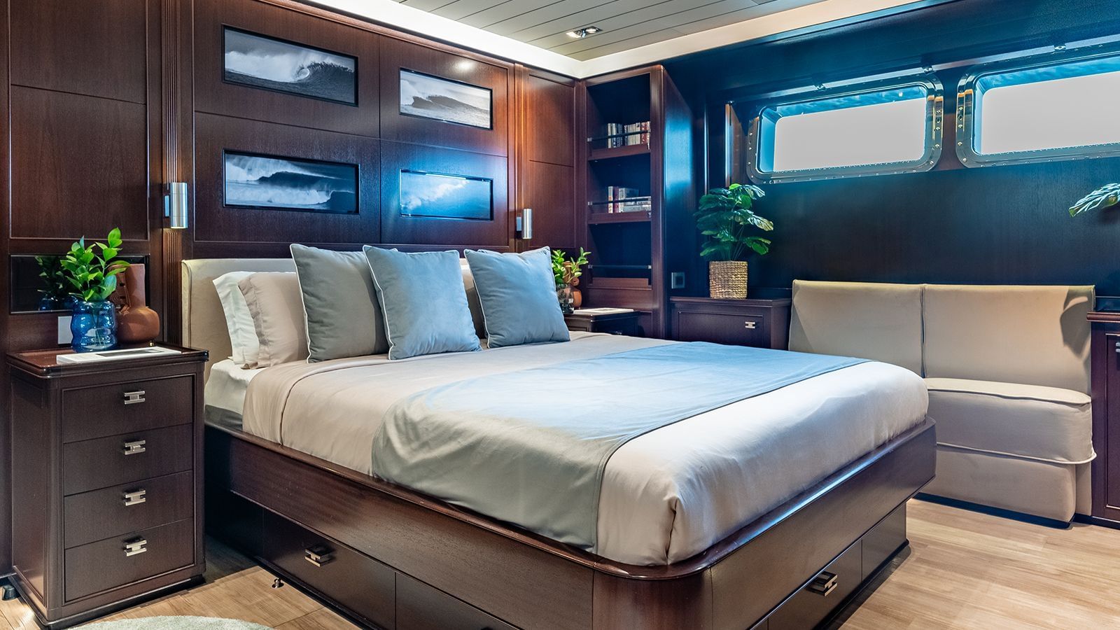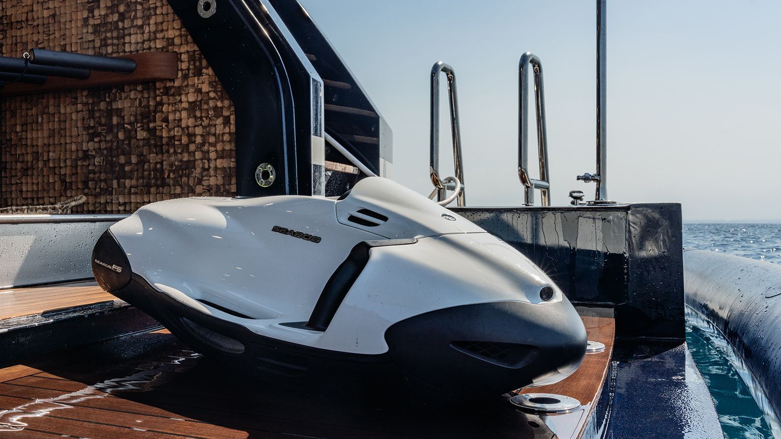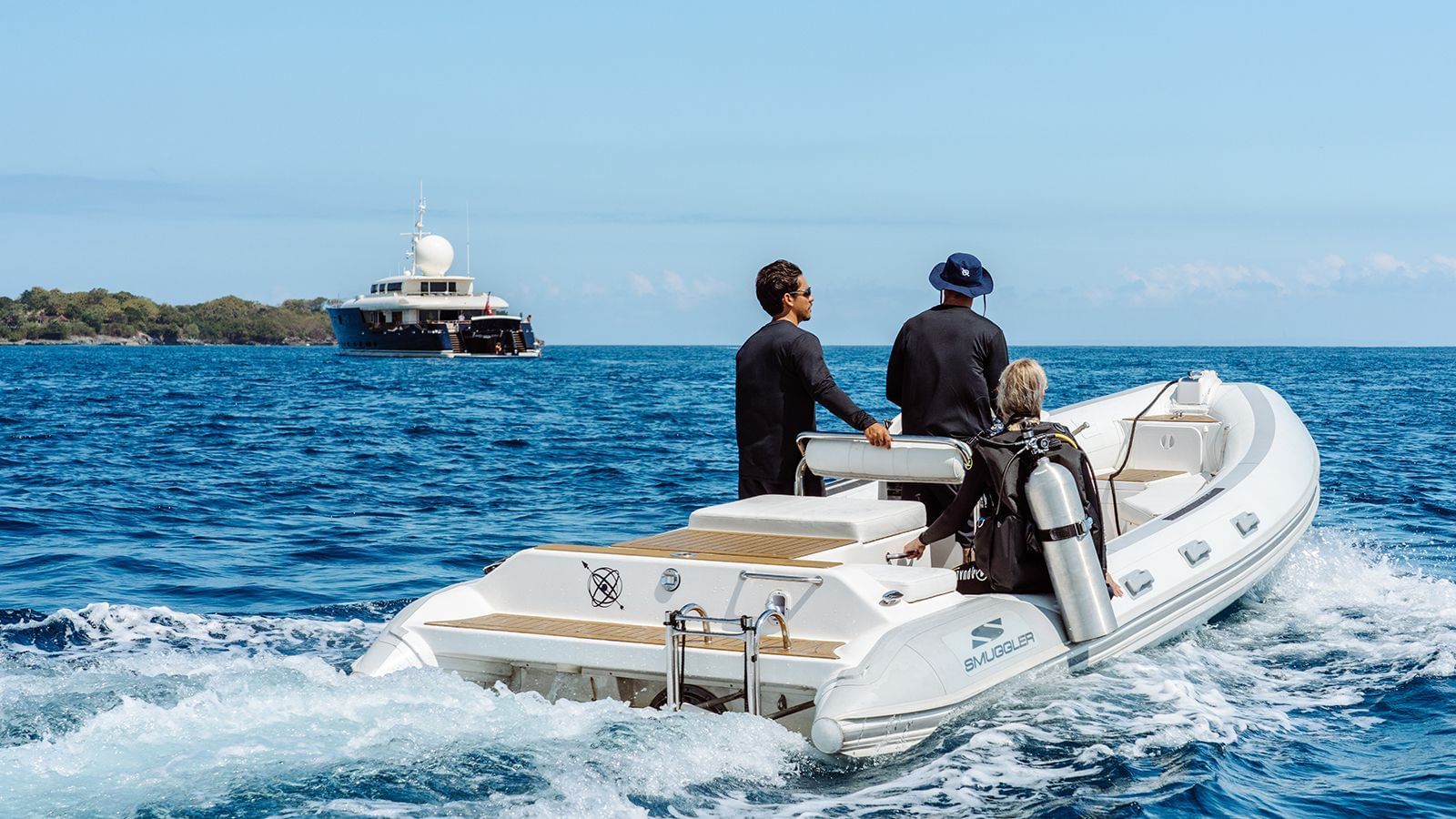 The expansive and uncluttered exterior decks offer ideal spaces for relaxation and entertainment, paired with a generous selection of water toys. The yacht also includes a comprehensive array of tenders, featuring a customized 31’ (9.5m) Zodiac and a Hurricane expedition RIB, conveniently stored in the forward garage, along with a sophisticated dive suite for underwater exploration.