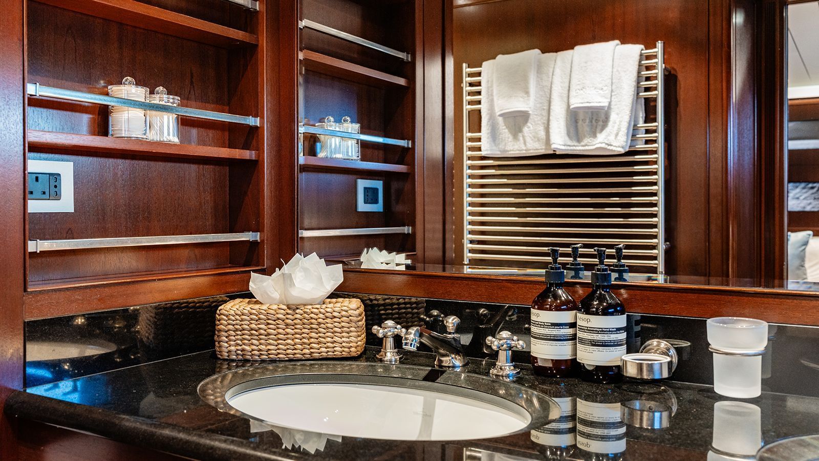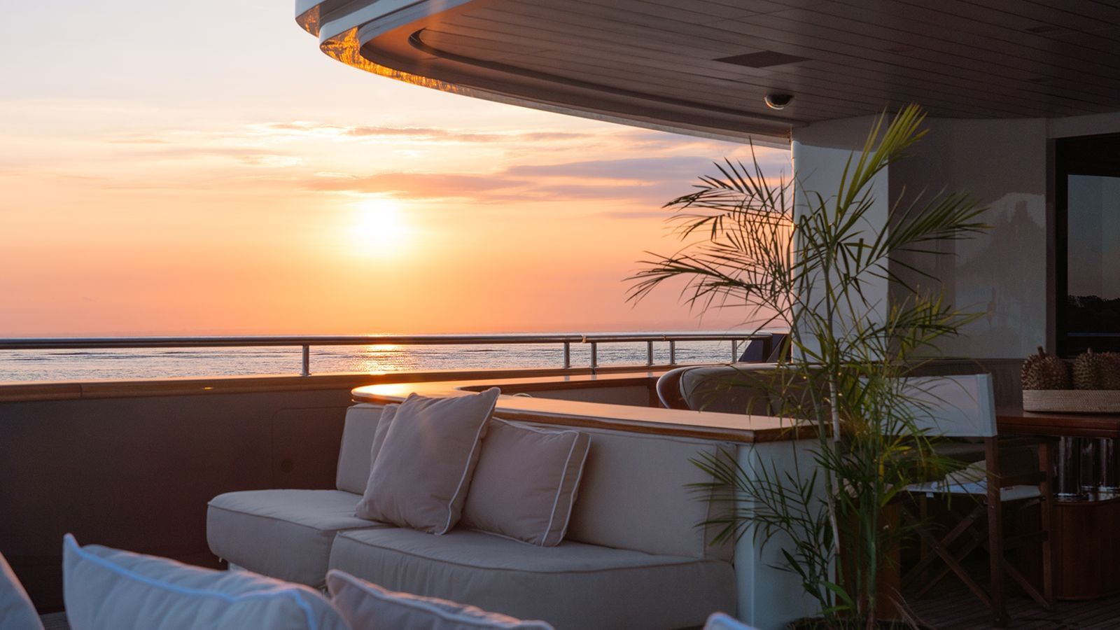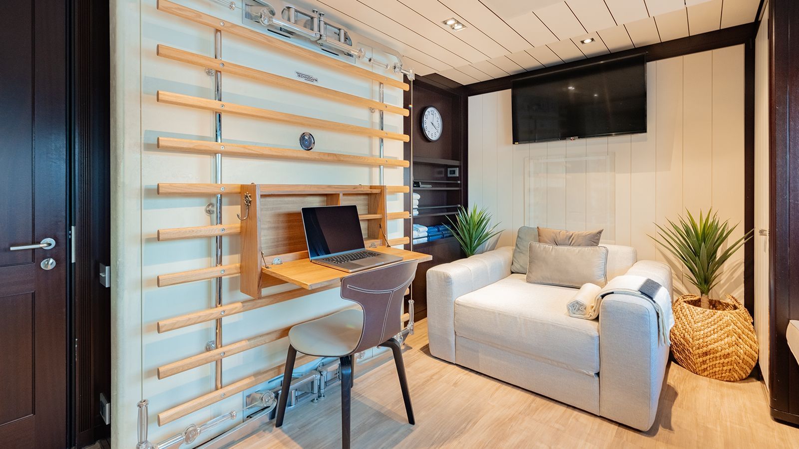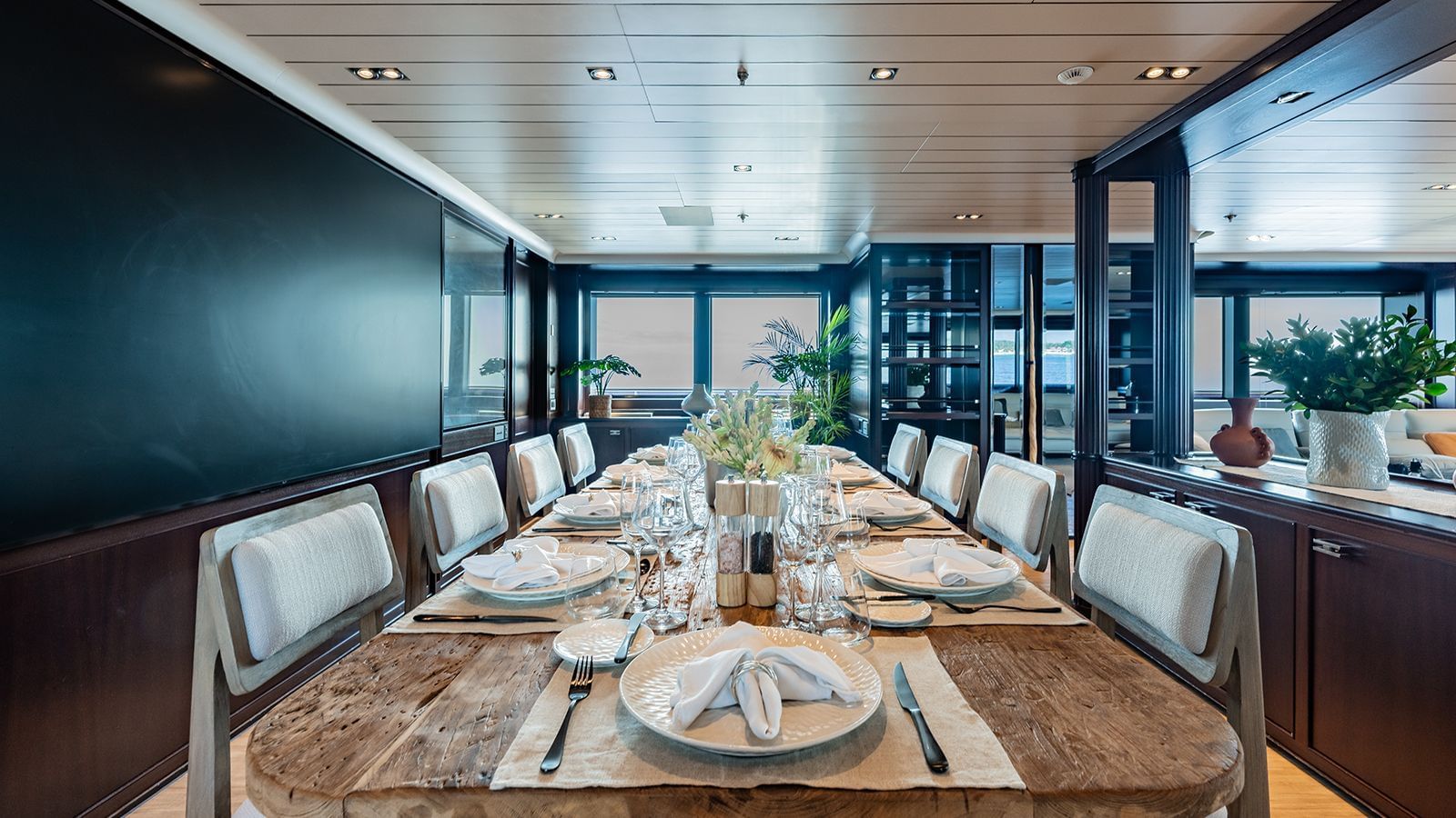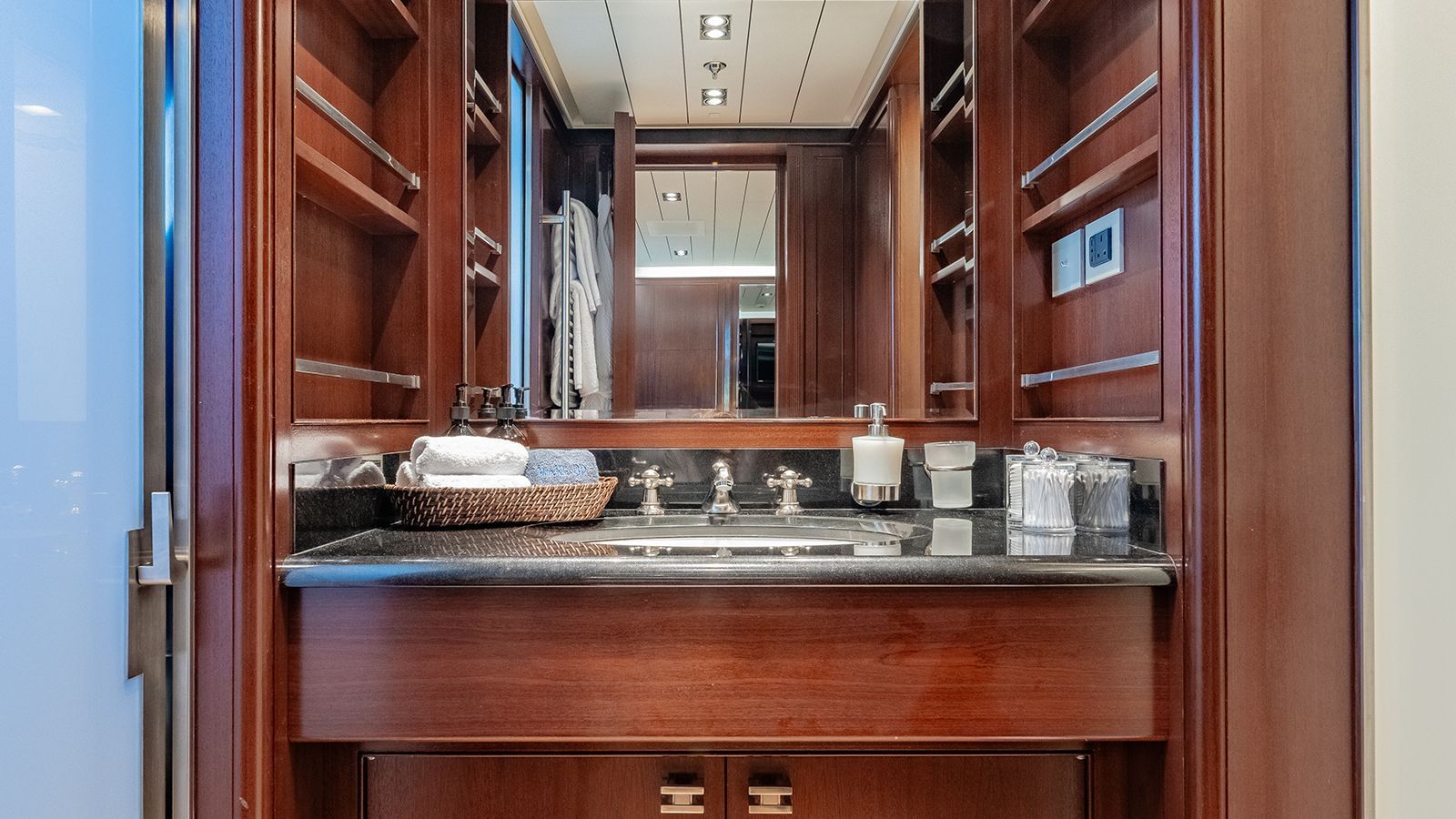 The expansive and uncluttered exterior decks offer ideal spaces for relaxation and entertainment, paired with a generous selection of water toys. The yacht also includes a comprehensive array of tenders, featuring a customized 31’ (9.5m) Zodiac and a Hurricane expedition RIB, conveniently stored in the forward garage, along with a sophisticated dive suite for underwater exploration.