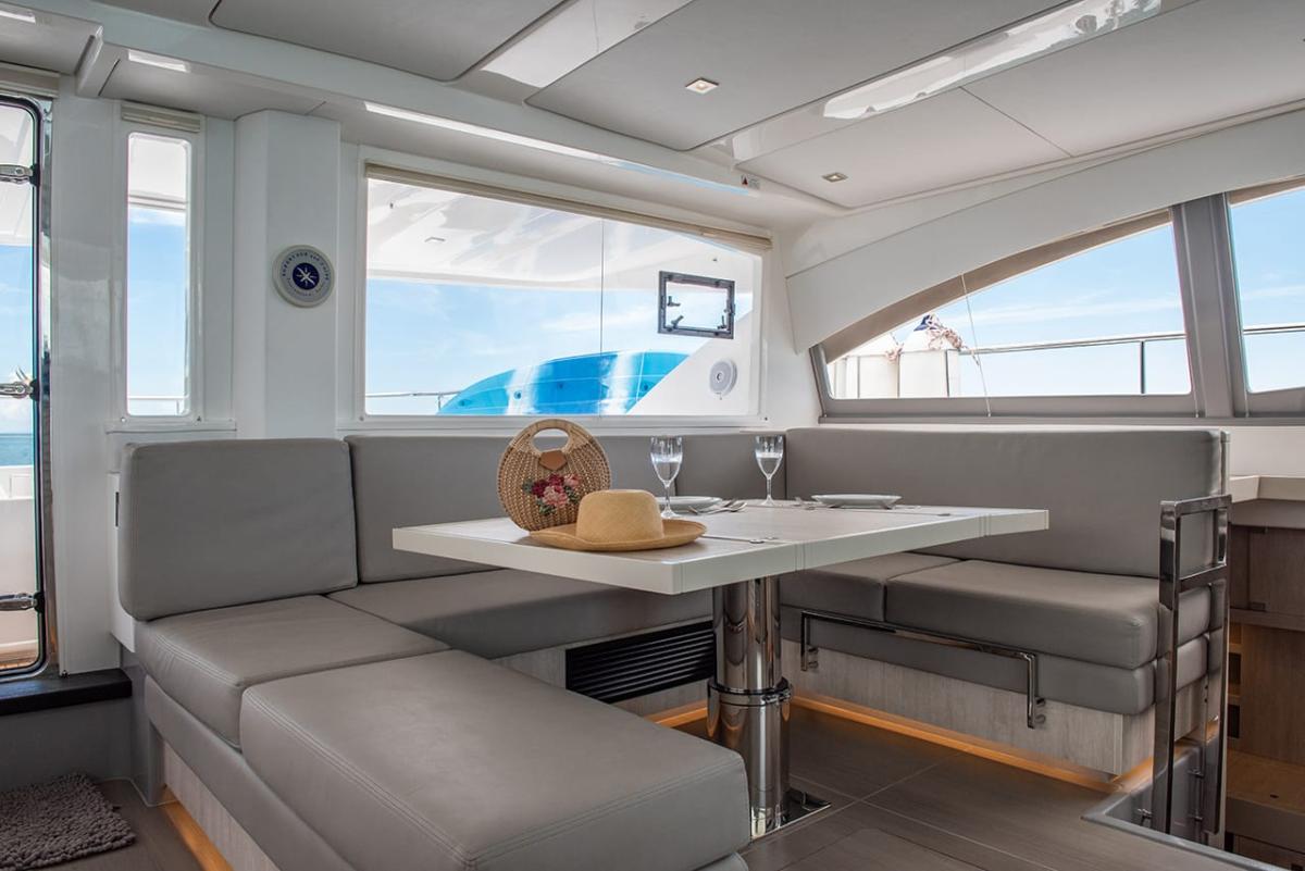 Inside, the yacht offers a large open saloon, a fully-equipped galley with the latest technology, and a three-cabin layout, each cabin complete with an en-suite bathroom. The saloon includes a spacious seating area with a convertible table, which can be transformed into a comfortable double bed for extra overnight guests. Outside, the deck provides a large covered dining area, while the flybridge features ample seating and a well-appointed barbecue setup, creating an ideal space for socializing and relaxation.