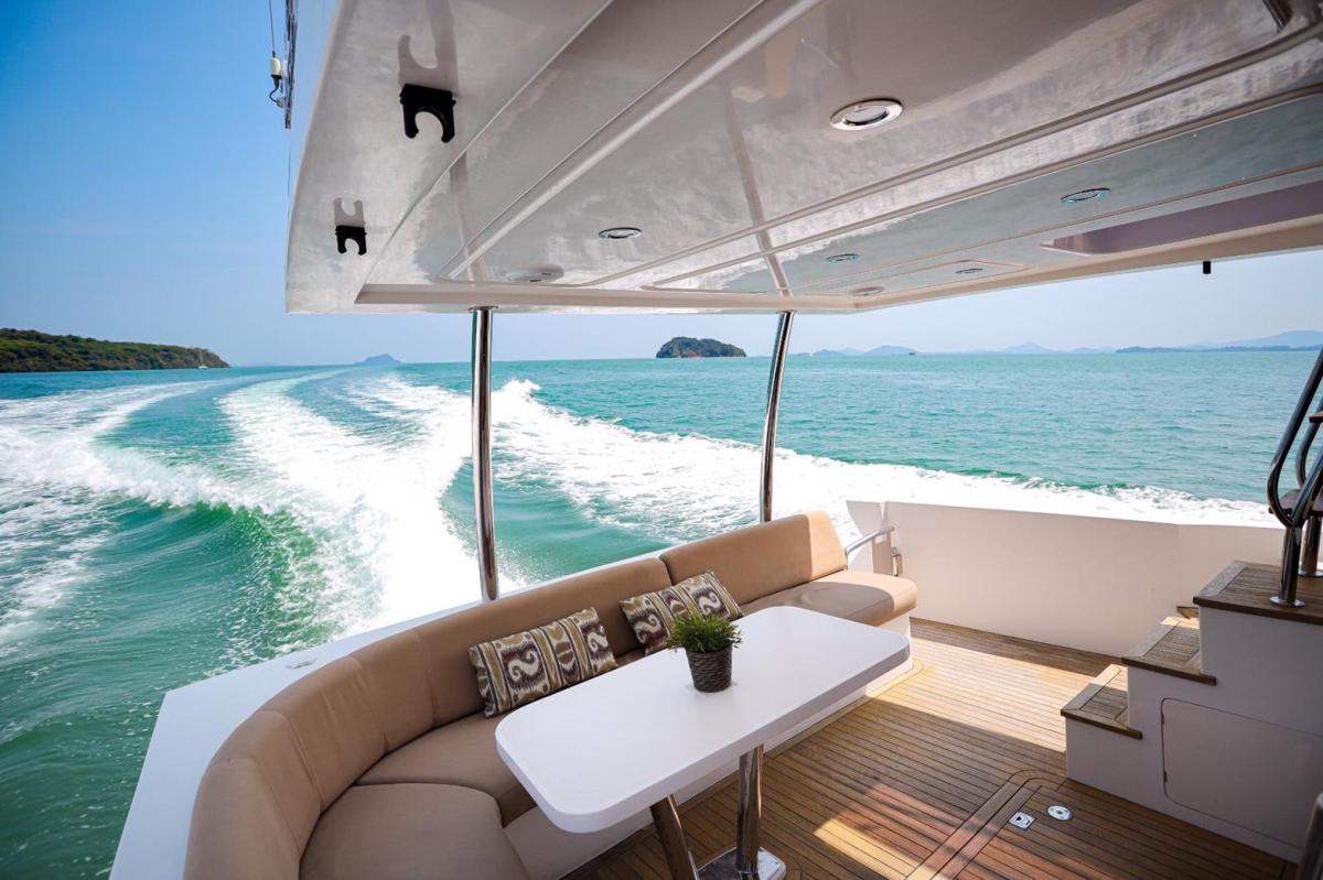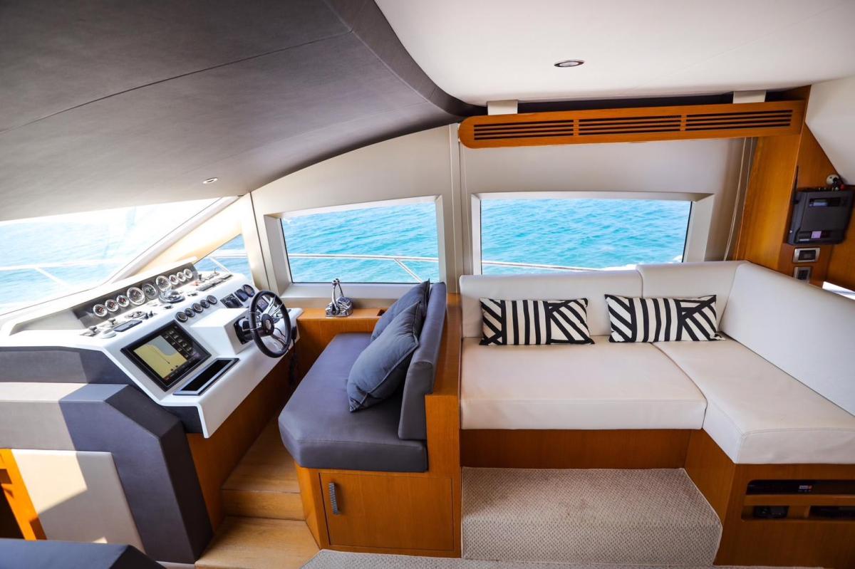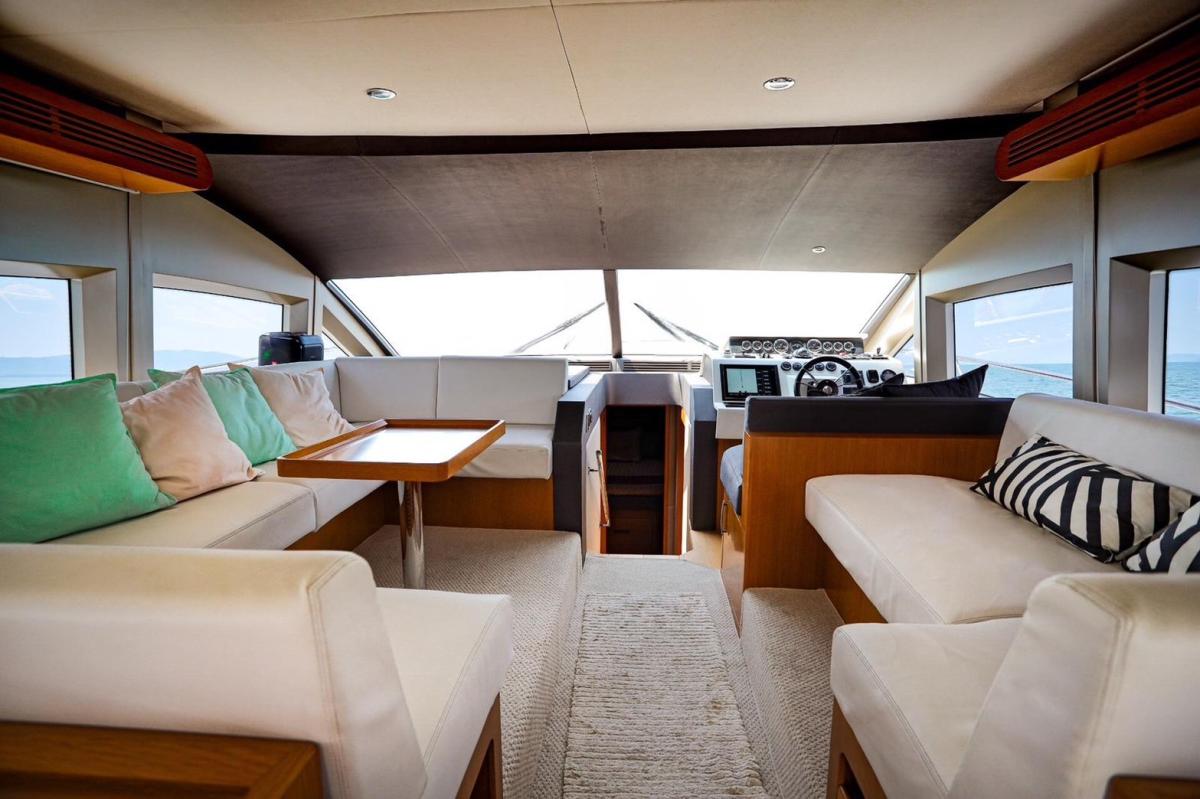 Featuring three bedrooms and two bathrooms, along with cleverly concealed crew accommodation for one, the Majesty 48 offers ample space for family getaways. The yacht includes a large, well-equipped kitchen and a flybridge that can seat up to 10 guests. The flybridge also includes a steering helm, allowing the captain to enjoy time with guests while navigating, making it a perfect blend of style, comfort, and functionality for frequent family adventures.