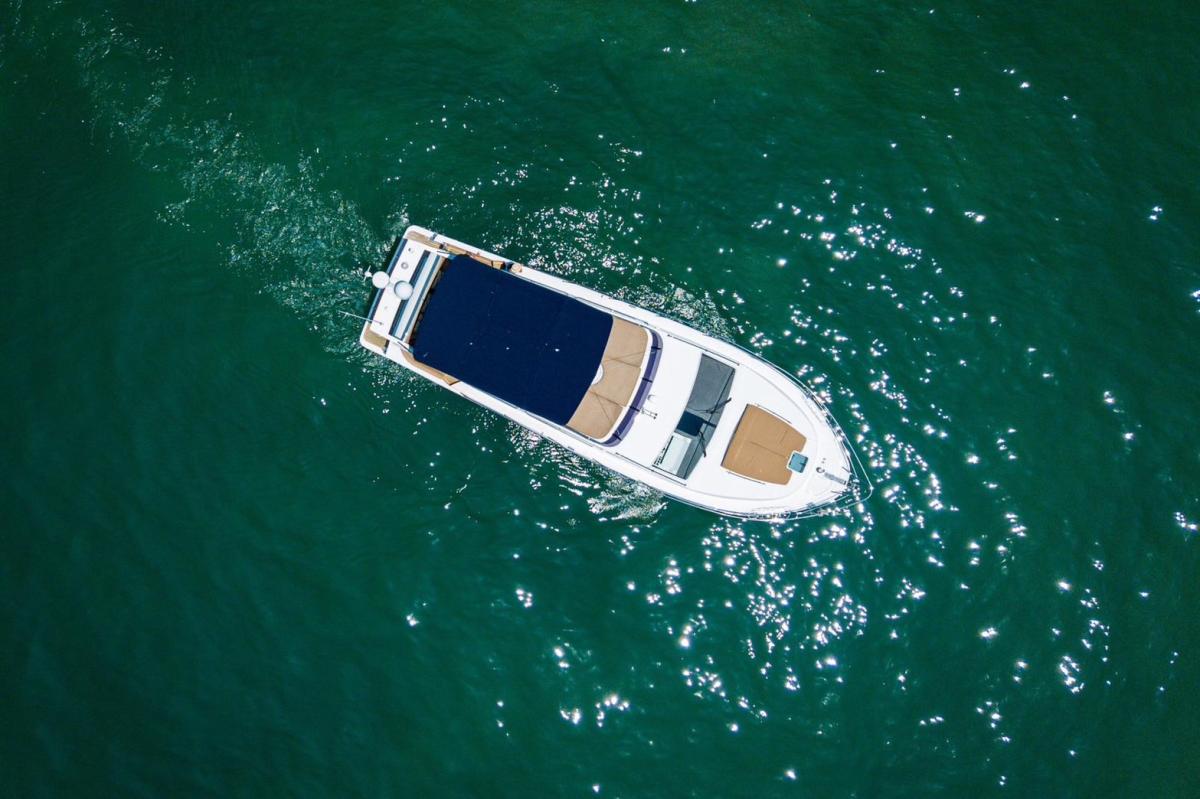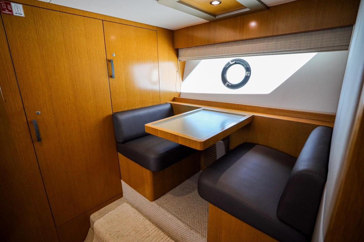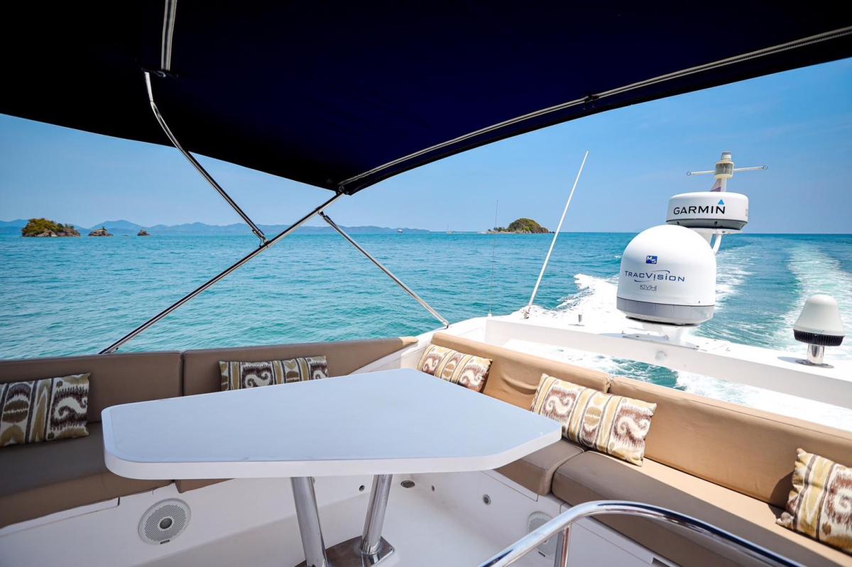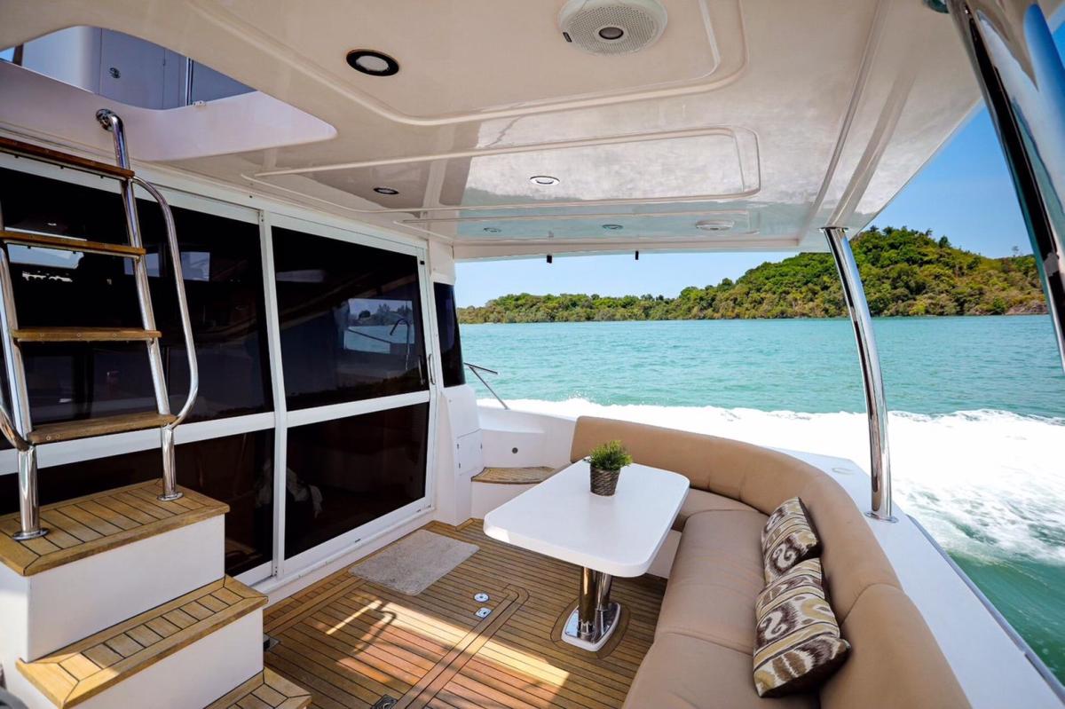 Featuring three bedrooms and two bathrooms, along with cleverly concealed crew accommodation for one, the Majesty 48 offers ample space for family getaways. The yacht includes a large, well-equipped kitchen and a flybridge that can seat up to 10 guests. The flybridge also includes a steering helm, allowing the captain to enjoy time with guests while navigating, making it a perfect blend of style, comfort, and functionality for frequent family adventures.