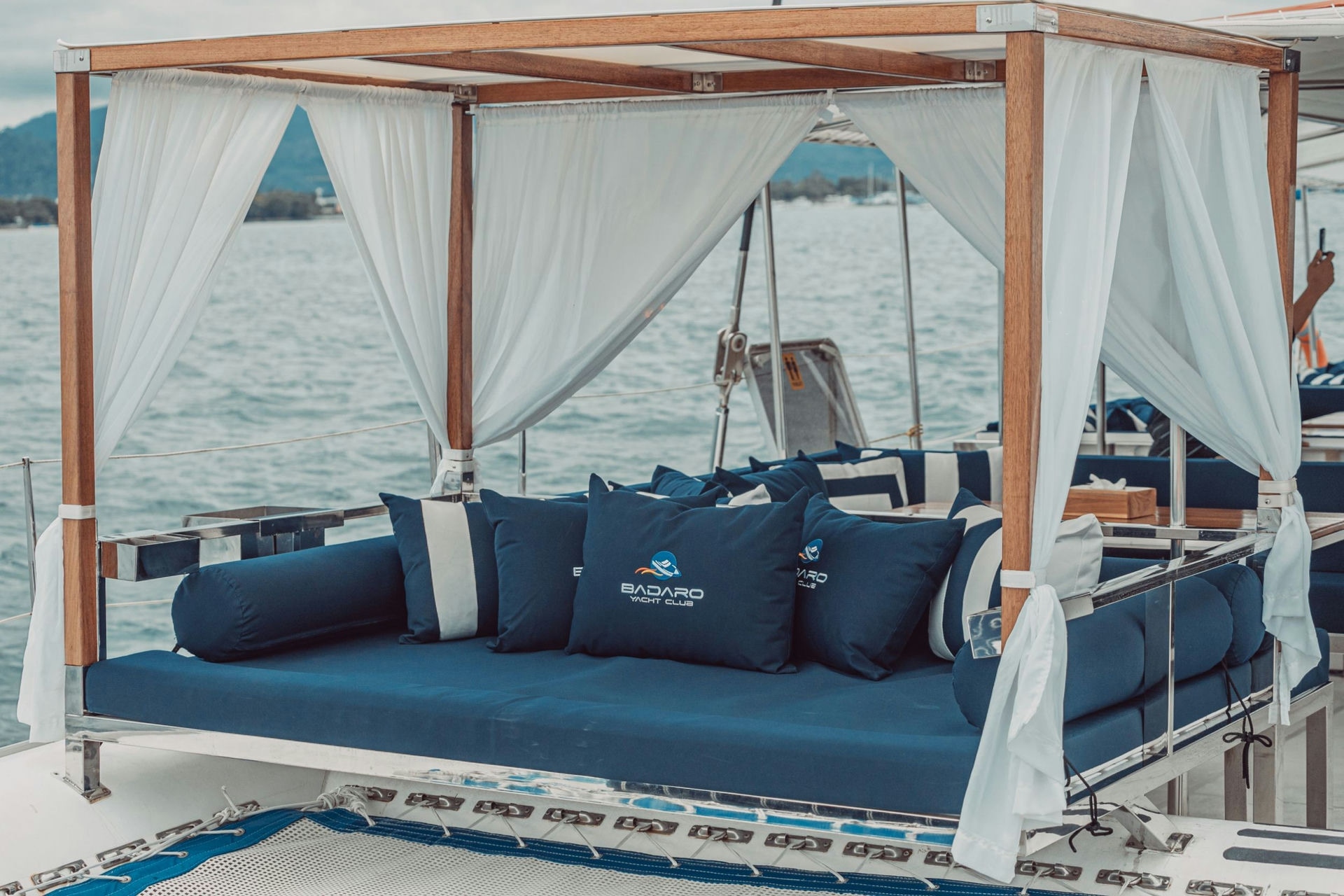 When it’s time to dance, head over to the dance floor and let the music set the mood. Our state-of-the-art sound system, featuring four large speakers and two bass speakers, ensures the party atmosphere stays alive. For those seeking a more relaxed activity, grab one of our three paddleboards and explore the surrounding crystal-clear waters, or enjoy a refreshing dip from one of the six trampolines located at the front of the vessel.