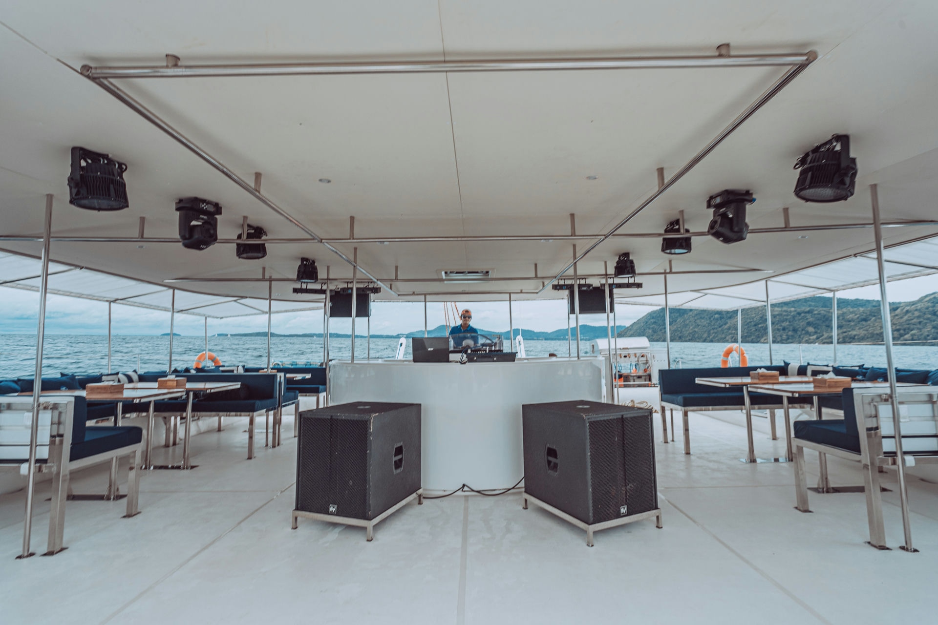 For your convenience, the catamaran includes two bathrooms, allowing guests to freshen up and stay comfortable throughout the day. To keep your drinks perfectly chilled, we provide an ice bucket, and for those needing a break from the sun, there are two shaded lounge seats for relaxation. With a DJ player onboard, you’ll have the perfect soundtrack to match your day on the water.