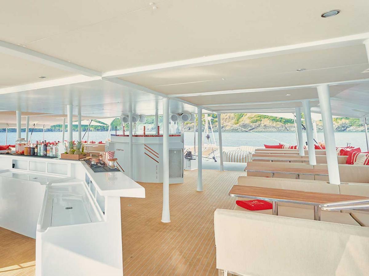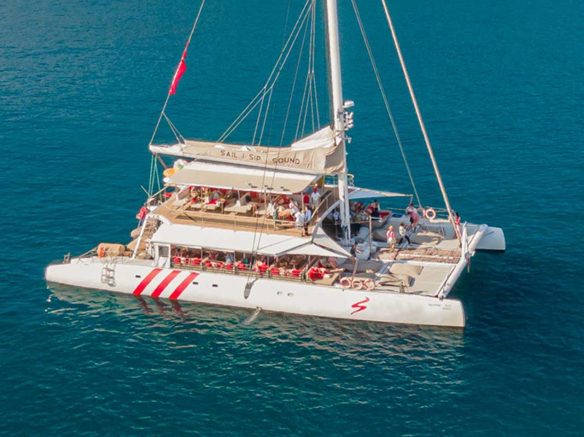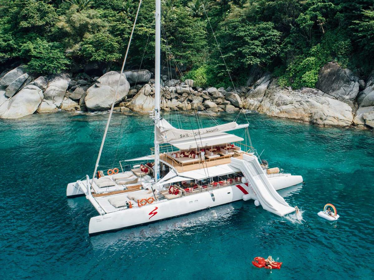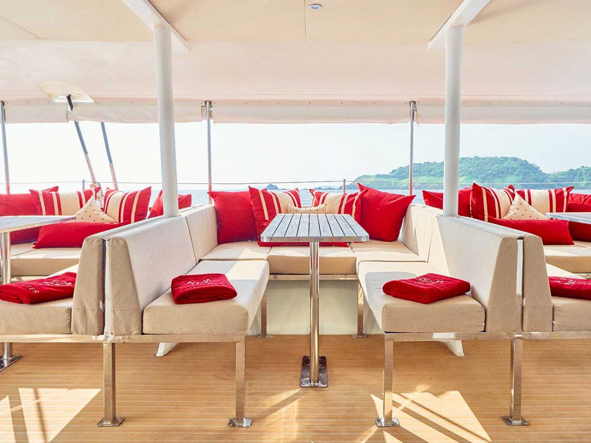 Accommodating up to 120 guests, this catamaran is your choice for an unforgettable celebration. Whether you’re in the mood for the liveliest, most vibrant party in Phuket or prefer a calm, pampering cruise, this vessel offers the flexibility to match your vibe. Guests are treated to a delicious array of finger foods, from authentic Thai specialties to sushi and tapas, alongside a bar offering a fine selection of champagnes, spirits, and crafted cocktails. An onboard DJ will set the perfect ambiance, whether you’re after smooth lounge beats or a high-energy club mix.