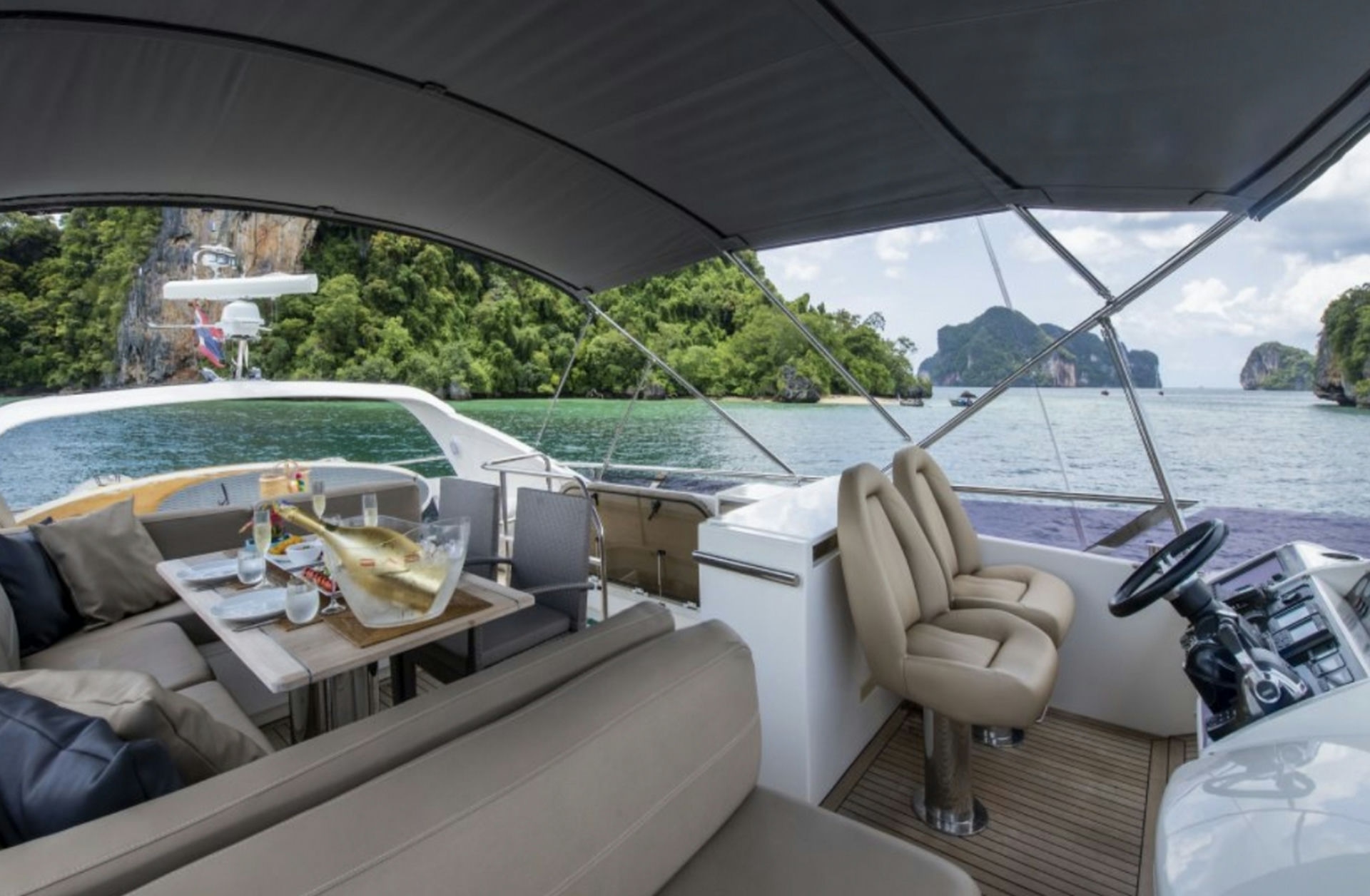 Experience stunning views and refreshing breezes on the spacious, shaded flybridge of the Princess 60ft, as you cruise between the picturesque islands of Phuket and Phang Nga Bay. Perfect for groups of friends, families, or business gatherings, this elegant yacht accommodates up to 16 passengers for day charters and offers overnight charters for island explorations around Phuket. For longer stays, the Princess 60ft provides luxurious accommodations for up to six guests in three double cabins, attended by a professional crew of three to ensure every need is met.
