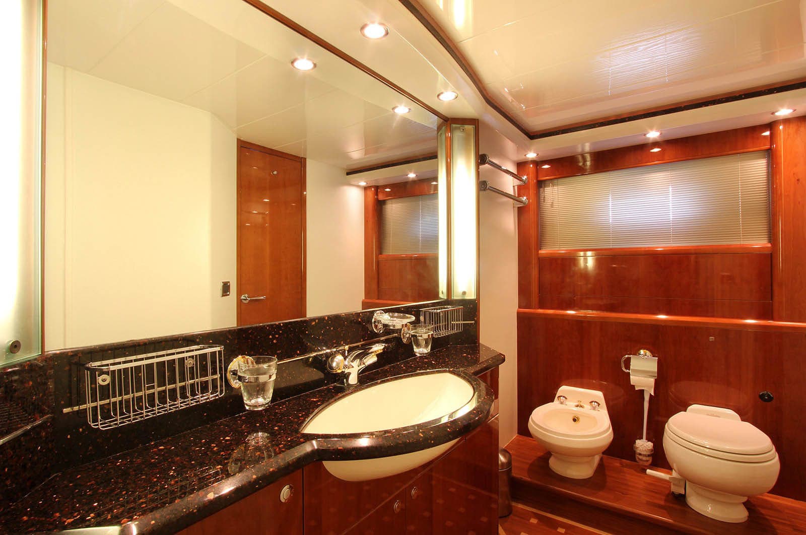 The master suite is a true highlight, spanning the full beam of the yacht and featuring triple vertical hull windows that flood the space with natural light. This suite includes a 32-inch flat-screen HD TV, DVD player, a large walk-in wardrobe with a secure safe, and an en-suite bathroom with a power/massage shower, oval double-ended bath, toilet, bidet, and marble accents. The VIP cabin is also full-width, with large oval windows for breathtaking views and a spacious en-suite with a walk-in shower. Two additional twin guest cabins, each equipped with music systems and large en-suite bathrooms with walk-in showers, provide ample accommodation.
