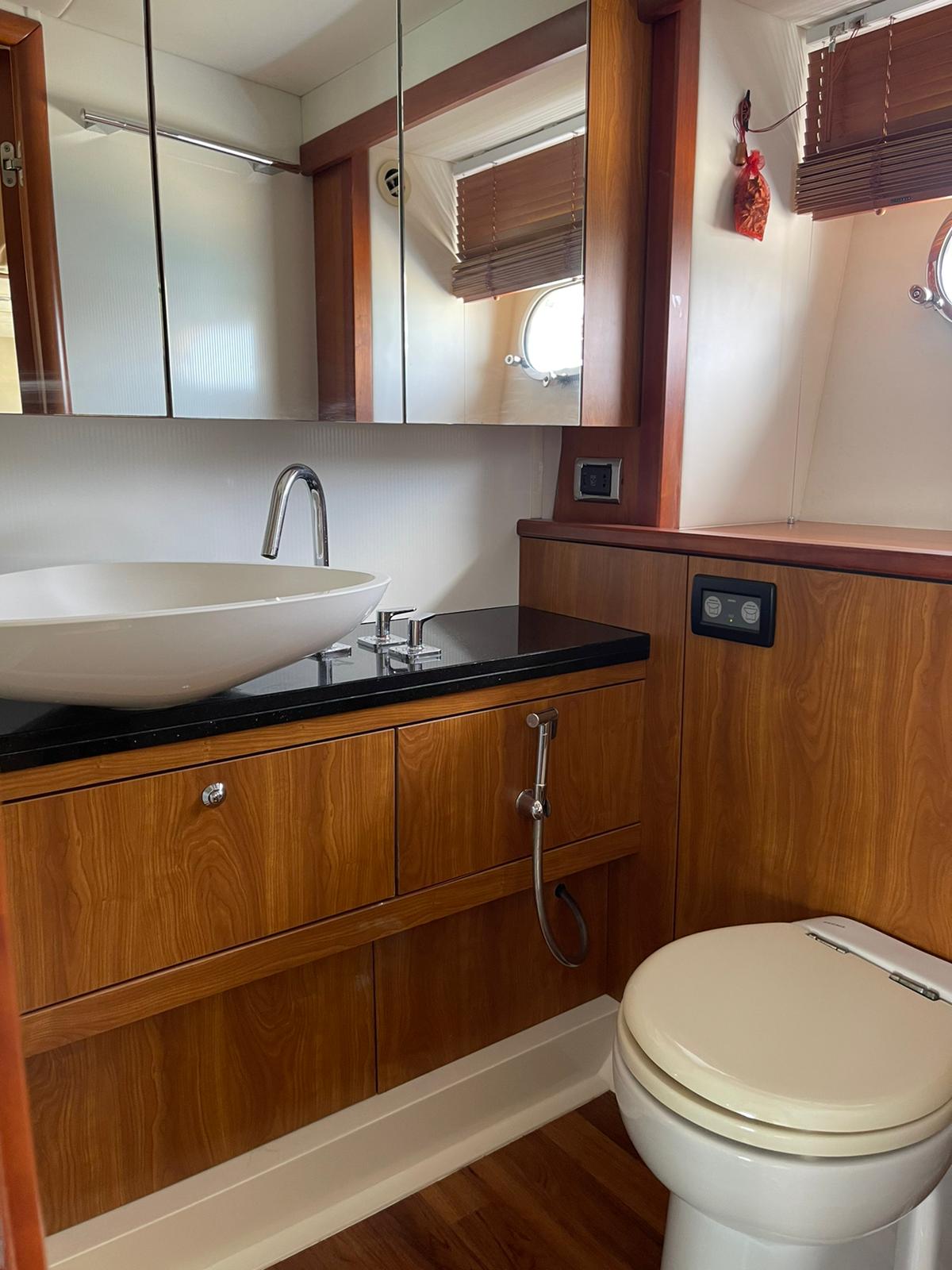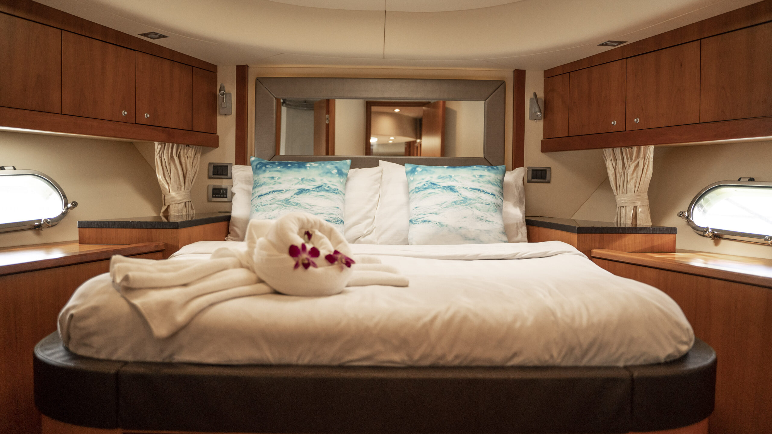 On the main deck, guests can relax in the comfortable salon, while the lower deck includes a helm with additional guest seating. The galley is conveniently located on the lower deck, making the main deck an inviting space for entertaining. SEASCAPE 2 accommodates up to six guests in three well-appointed staterooms, ensuring a comfortable and memorable journey.